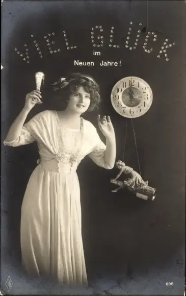 Ak Glückwunsch Neujahr, Frau mit Sektglas, Uhr