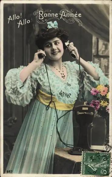 Ak Glückwunsch Neujahr, Frau mit Telefon