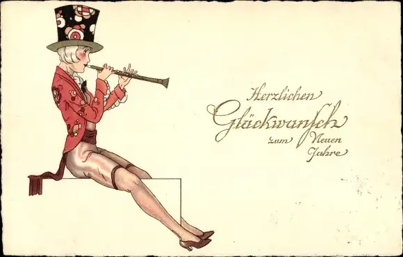Ak Glückwunsch Neujahr, Frau mit Zylinder und Flöte