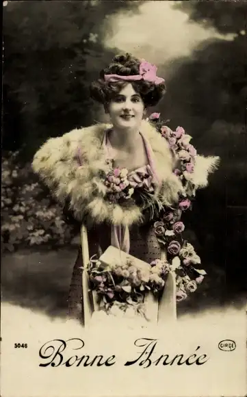 Ak Glückwunsch Neujahr, Frau mit einer Blumengirlande