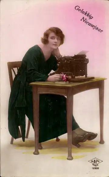 Ak Glückwunsch Neujahr, Frau mit einer Schreibmaschine