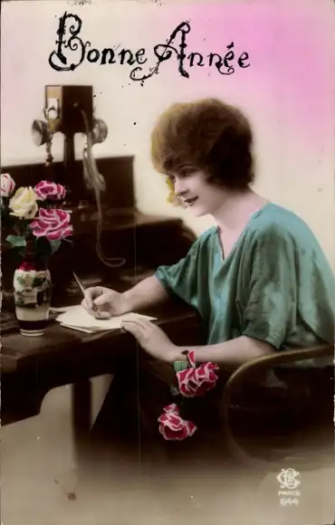 Ak Glückwunsch Neujahr, Frau schreibt einen Brief, Telefon