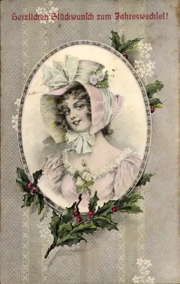 Ak Glückwunsch Neujahr, Frauenportrait, Stechpalmenzweige