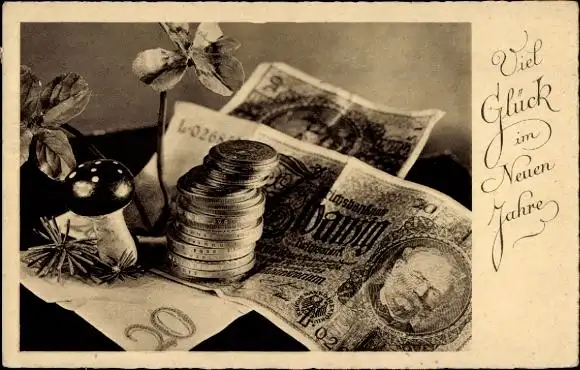 Ak Glückwunsch Neujahr, Geldscheine, Münzen, Pilze