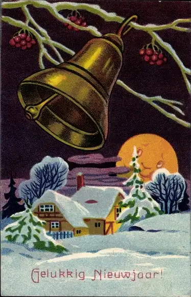 Ak Glückwunsch Neujahr, Glocke, Landschaft, Mondschein
