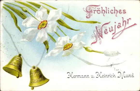 Ak Glückwunsch Neujahr, Glocken, Weiße Blumen