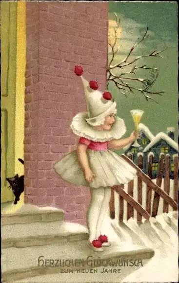 Ak Glückwunsch Neujahr, Harlekinmädchen mit Sektglas