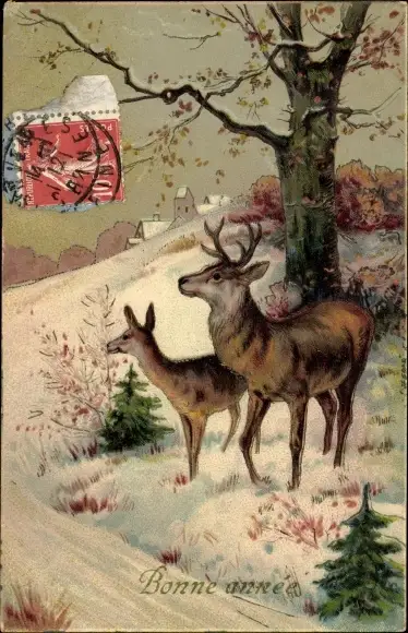 Ak Glückwunsch Neujahr, Hirsch, Reh, Tannenbaum, Schnee