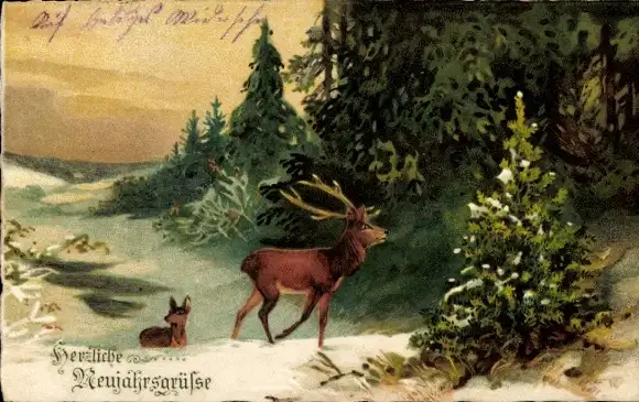 Ak Glückwunsch Neujahr, Hirsch, Reh, Wald