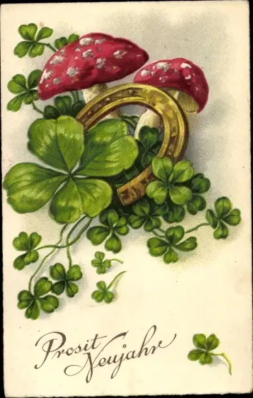 Ak Glückwunsch Neujahr, Hufeisen, Fliegenpilze, Kleeblätter