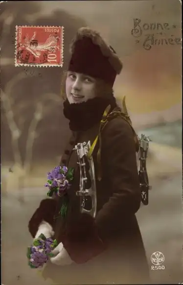 Ak Glückwunsch Neujahr, Junge Frau, Schlittschuhe