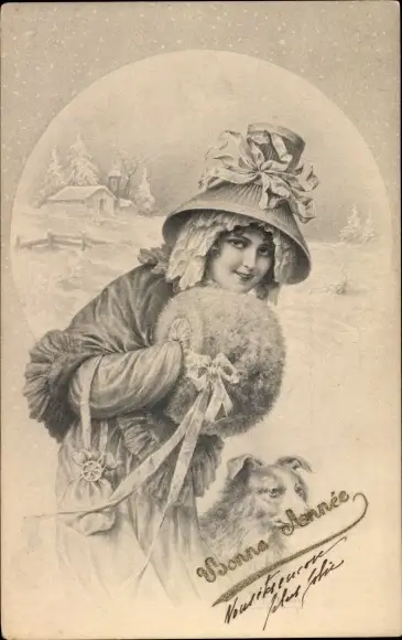 Ak Glückwunsch Neujahr, Junge Frau mit Hund, Munk