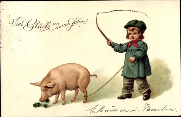 Ak Glückwunsch Neujahr, Junge, Schwein, Glücksklee