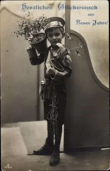Ak Glückwunsch Neujahr, Junge als Postbote mit Kleeblättern