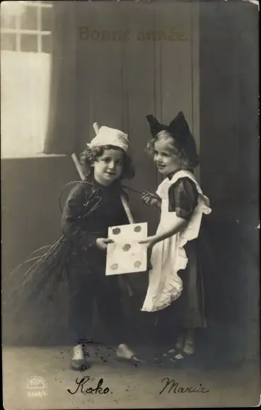Ak Glückwunsch Neujahr, Junge als Schornsteinfeger, Mädchen als Putzfrau