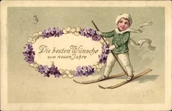 Ak Glückwunsch Neujahr, Junge auf Skiern