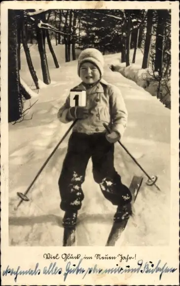 Ak Glückwunsch Neujahr, Junge auf Skiern mit Kalender