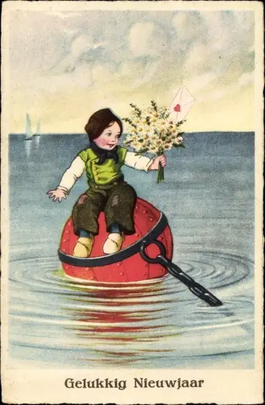Ak Glückwunsch Neujahr, Junge bringt Geschenke, Blumenstrauß, Brief, Boje
