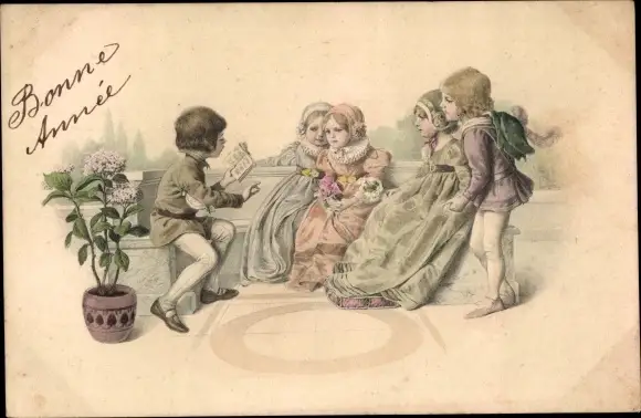 Ak Glückwunsch Neujahr, Junge liest ein Gedicht vor, Mädchen hören zu, Blumen, Blumentopf