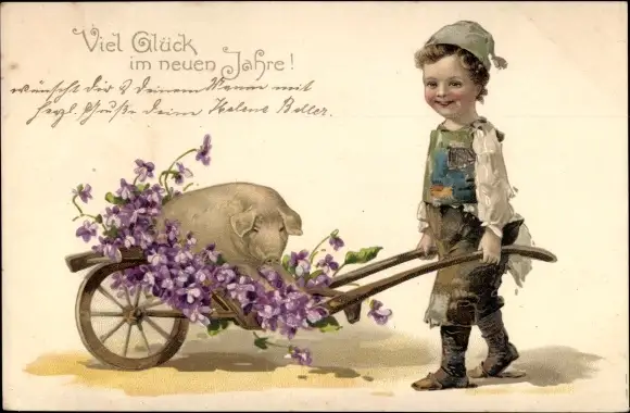 Ak Glückwunsch Neujahr, Junge mit Handkarren, Schwein