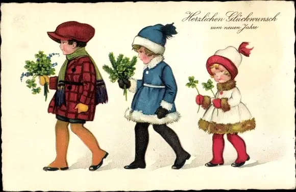 Ak Glückwunsch Neujahr, Junge und Mädchen mit Kleeblättern