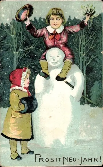 Ak Glückwunsch Neujahr, Junge und Mädchen mit Schneemann