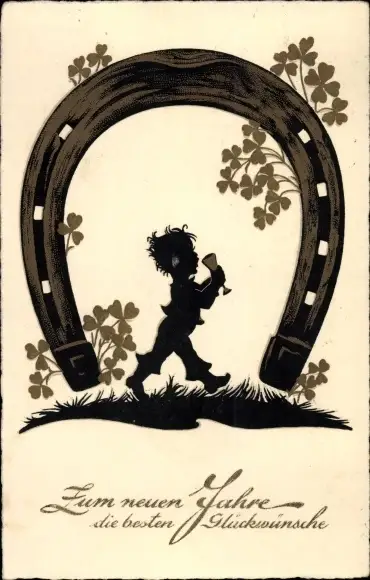 Ak Glückwunsch Neujahr, Junge unter einem Hufeisen, Kleeblätter