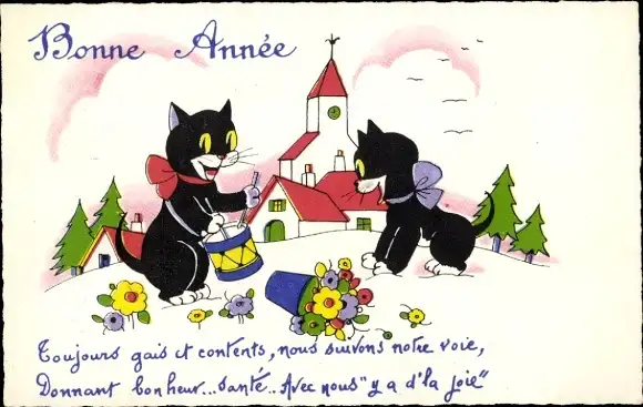 Ak Glückwunsch Neujahr, Katzen, Trommel, Blumen
