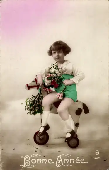 Ak Glückwunsch Neujahr, Kind, Holzpferd