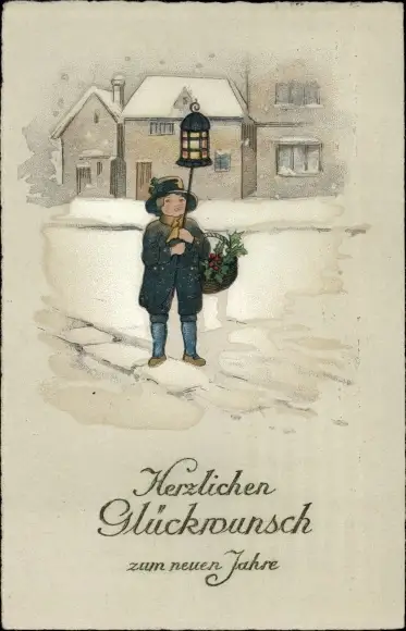 Ak Glückwunsch Neujahr, Kind, Laterne, Stechpalme, Korb