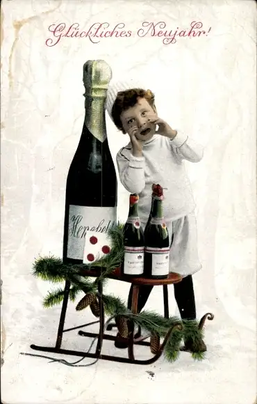 Ak Glückwunsch Neujahr, Kind, Sektflaschen, Schlitten