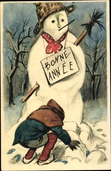 Ak Glückwunsch Neujahr, Kind baut einen Schneemann