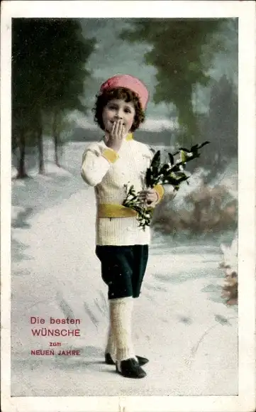 Ak Glückwunsch Neujahr, Kind im Schnee, Misteln