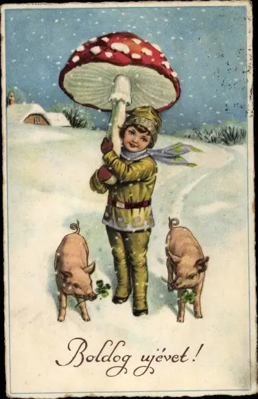 Ak Glückwunsch Neujahr, Kind mit Pilz, Schweine, Glücksklee