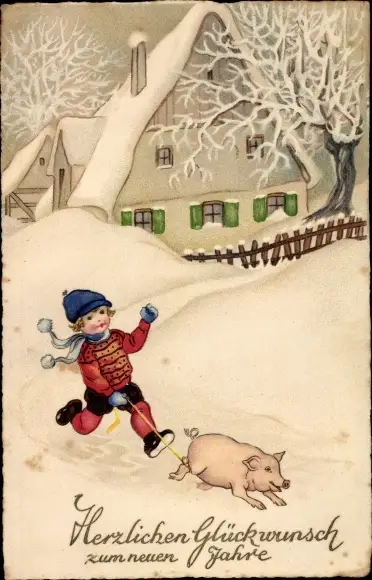 Ak Glückwunsch Neujahr, Kind mit Schwein an der Leine