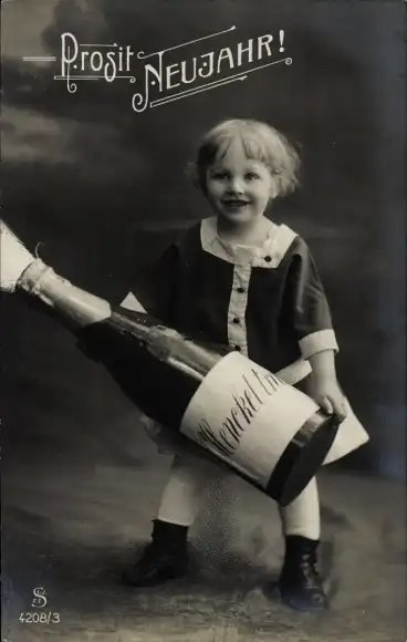 Ak Glückwunsch Neujahr, Kind mit Sektflasche