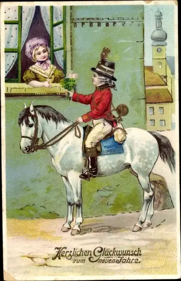 Ak Glückwunsch Neujahr, Kind zu Pferde, Geschenk, Besuch, Mädchen am Fenster