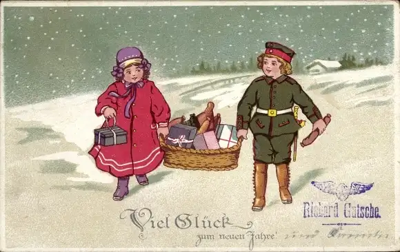 Ak Glückwunsch Neujahr, Kinder, Geschenke, Junge in Uniform