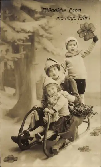 Ak Glückwunsch Neujahr, Kinder, Schlitten, Glücksklee