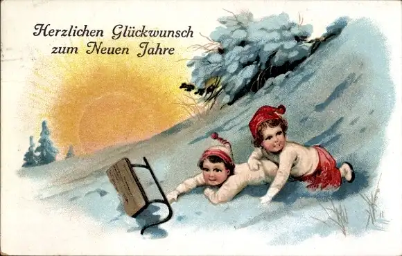 Ak Glückwunsch Neujahr, Kinder, Schlitten, Schnee