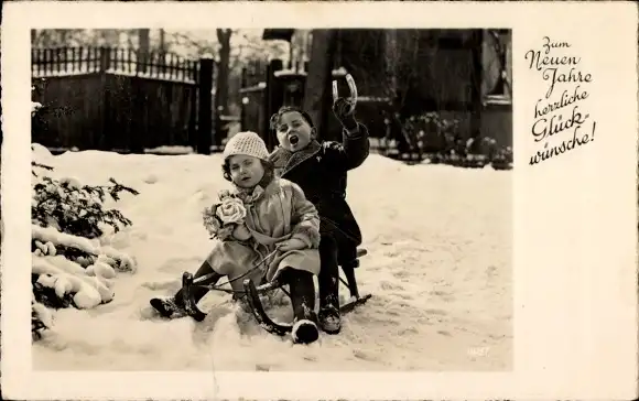 Ak Glückwunsch Neujahr, Kinder, Schlitten, Winter