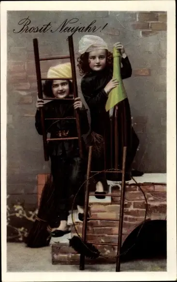 Ak Glückwunsch Neujahr, Kinder als Schornsteinfeger, Sektflasche