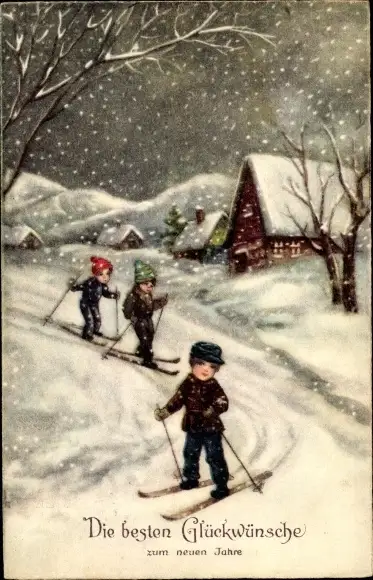 Ak Glückwunsch Neujahr, Kinder auf Skiern im Schneefall