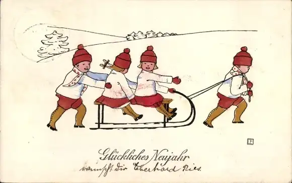 Ak Glückwunsch Neujahr, Kinder auf einem Schlitten