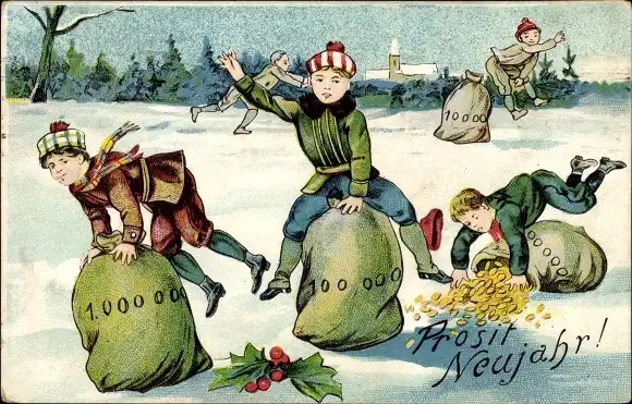 Ak Glückwunsch Neujahr, Kinder beim Sackhüpfen mit Geldsäcken, Stechpalmenzweig