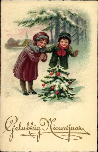 Ak Glückwunsch Neujahr, Kinder bewundern einen Weihnachtsbaum, Wald