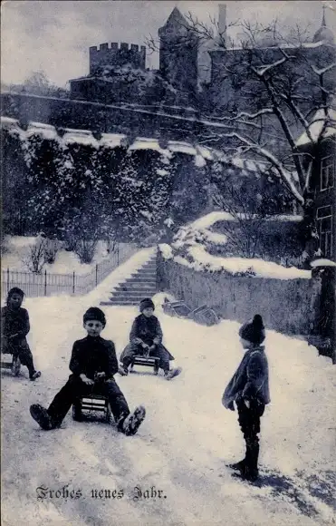 Ak Glückwunsch Neujahr, Kinder fahren Schlitten