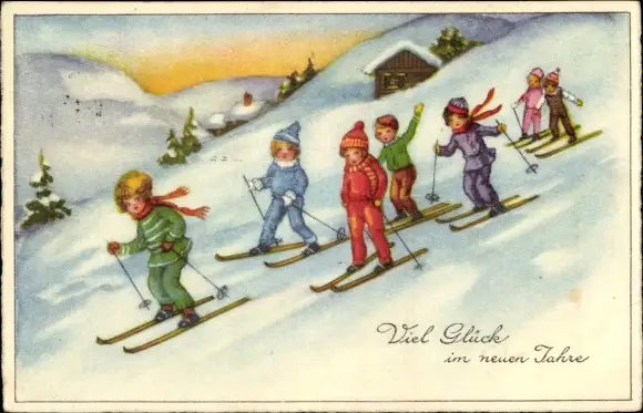 Ak Glückwunsch Neujahr, Kinder fahren Ski