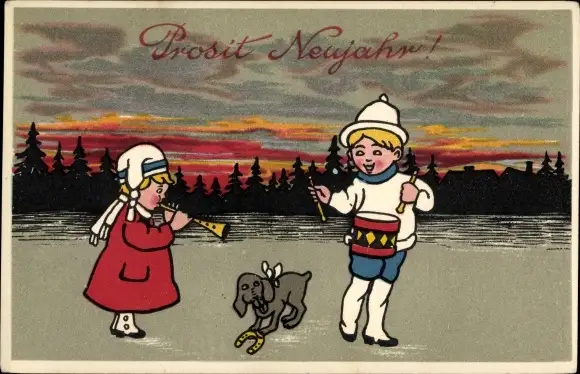 Ak Glückwunsch Neujahr, Kinder mit Musikinstrumenten, Hund