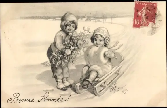 Ak Glückwunsch Neujahr, Kinder mit Schlitten und Mistelzweigen